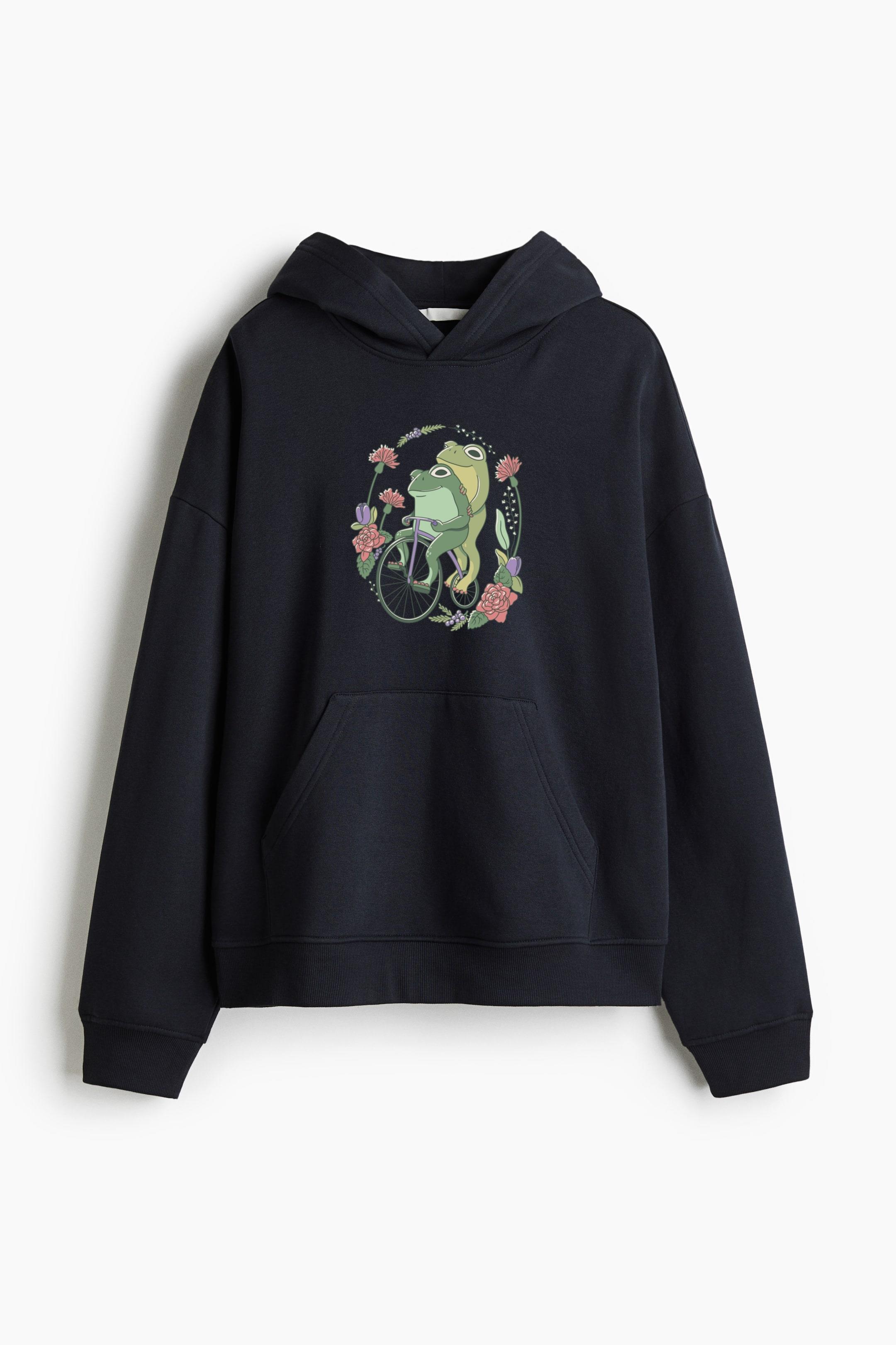 Stay warm and stylish with our Two Frogs Riding A Bicycle Surrounded By Flowers Loose-Fit Printed Hoodie Loose-Fit Printed Hoodie. Made from a soft cotton-blend fleece with a printed design, this hoodie features a generous yet balanced fit, wrap-front hood, and a brushed interior for lasting comfort.